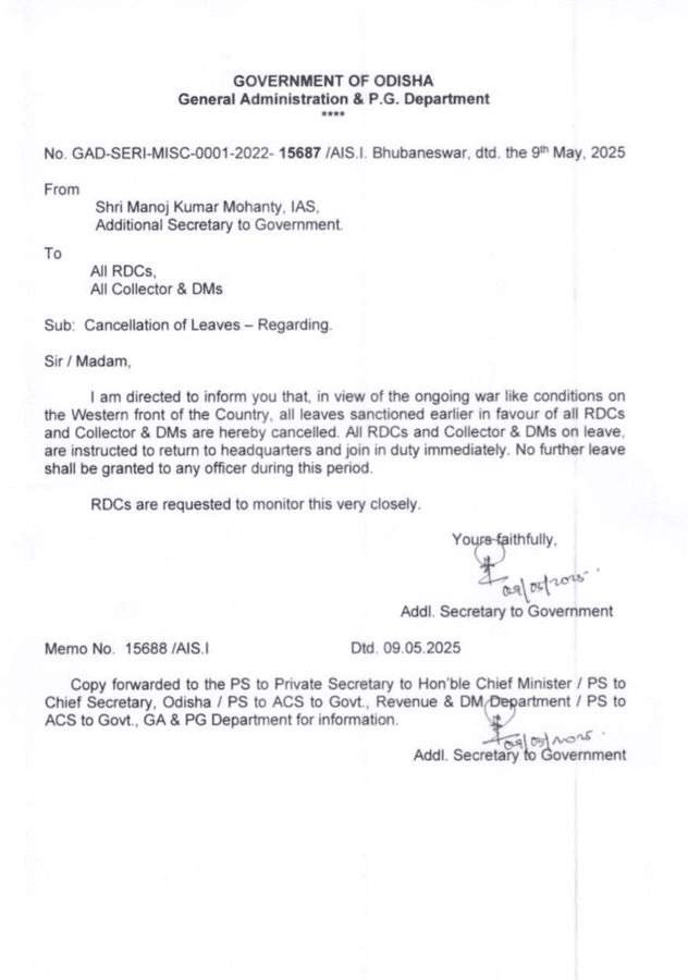 भुवनेश्वर,10 मई 2025/ ओडिशा सरकार ने युद्ध जैसे हालात को देखते हुए राजस्व मंडल अधिकारी (आरडीसी), कलेक्टर और जिला मजिस्ट्रेट (डीएम) की सभी स्वीकृत छुट्टियां रद्द कर दी हैं। सरकार ने इन अधिकारियों को तुरंत मुख्यालय लौटने और ड्यूटी पर लौटने का निर्देश दिया है.