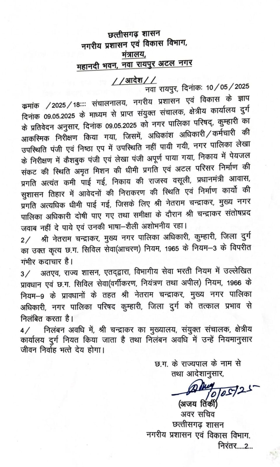 Home छत्तीसगढ़ CG BREAKING: मुख्य नगर पालिका अधिकारी निलंबित, आदेश जारी शासकीयछत्तीसगढ़ CG BREAKING: मुख्य नगर पालिका अधिकारी निलंबित, आदेश जारी By संतोष दीवान - May 11, 2025 15 0 FacebookTwitterWhatsAppTelegramEmailPrintCopy URL आकाशवाणी.इन रायपुर, 11 मई 2025/ मुख्य नगर पालिका अधिकारी नेतराम चंद्राकर को निलंबित कर दिया गया है। जिसका आदेश नगरी प्रशासन विभाग द्वारा जारी कर दिया गया है.