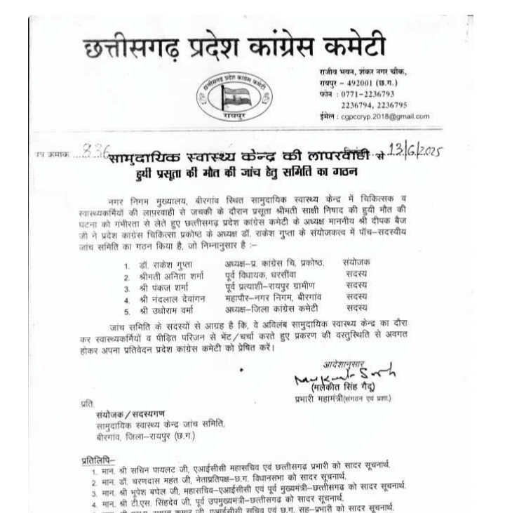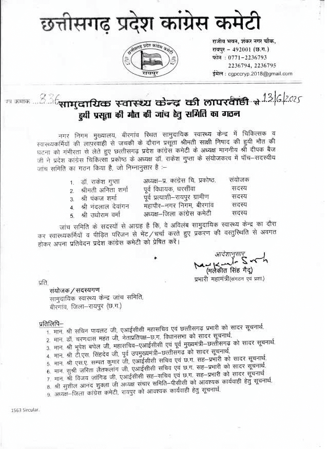 रायपुर, 14 जून 2025/ राजधानी रायपुर के बिरगांव स्थित सामुदायिक स्वास्थ्य केंद्र में लापरवाही के चलते प्रसूता साक्षी निषाद की मौत हो गई. इस मामले में कांग्रेस प्रदेश अध्यक्ष दीपक बैज ने जांच समिति का गठन किया है. इस समिति में 5 सदस्य को शामिल किया गया है. जांच समिति का कांग्रेस चिकित्सा प्रकोष्ठ के अध्यक्ष डॉ. राकेश गुप्ता को संयोजक बनाया गया है. इसके अलावा पूर्व विधायक अनीता वर्मा, रायपुर ग्रामीण छाया विधायक पंकज शर्मा, ग्रामीण ज़िलाध्यक्ष उधो वर्मा और नंदलाल देवांगन भी कमेटी में शामिल हैं.
