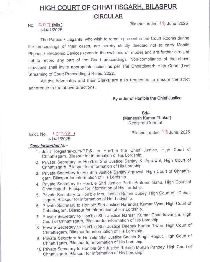 बिलासपुर, 19 जून 2025/ छत्तीसगढ़ हाई कोर्ट परिसर में अब मोबाइल फोन और अन्य इलेक्ट्रॉनिक उपकरणों को लेकर जाना पूरी तरह प्रतिबंधित कर दिया गया है। हाई कोर्ट के रजिस्ट्रार जनरल मनीष कुमार ठाकुर द्वारा जारी आदेश के मुताबिक, न्यायालय कक्ष में उपस्थित रहने वाले पक्षकारों और वादियों को स्पष्ट निर्देश दिए गए हैं कि वे मोबाइल या कोई भी इलेक्ट्रॉनिक डिवाइस (भले ही स्विच ऑफ मोड में हो) अंदर न ले जाएं.