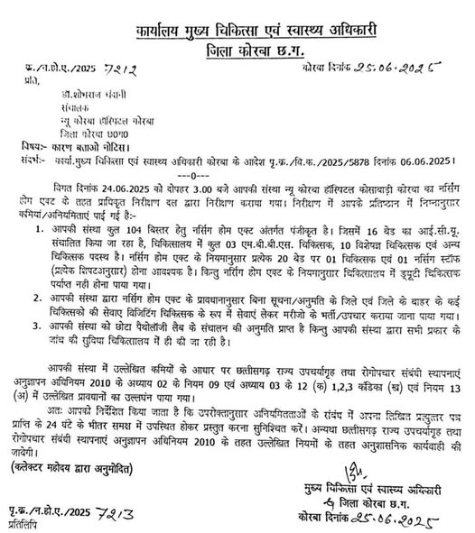 कोरबा, 26 जून 2025/ जिले के कोसाबाड़ी क्षेत्र में स्थित एनकेएच ग्रुप के न्यू कोरबा हॉस्पिटल (NKH Hospital) को सीजी नर्सिंग होम एक्ट (CG Nursing Home Act,) के प्रावधानों के उल्लंघन को लेकर नोटिस जारी किया गया है.