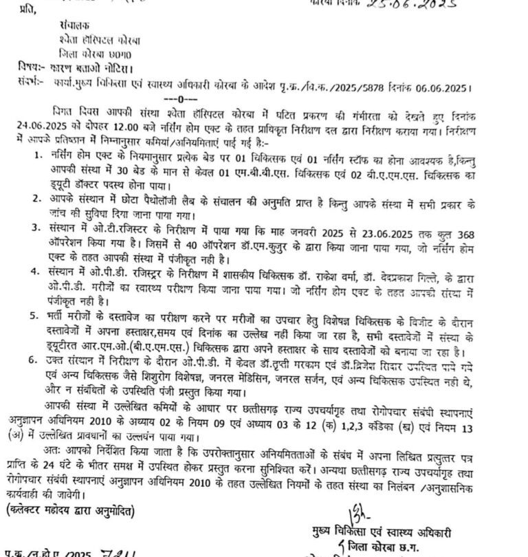 कोरबा, 26 जून 2025/ मुख्य चिकित्सा एवं स्वास्थ्य अधिकारी कार्यालय द्वारा कोरबा स्थित श्वेता हॉस्पिटल को कारण बताओ नोटिस जारी किया गया है। नोटिस में हॉस्पिटल प्रबंधन को 24 घंटे के भीतर अनियमितताओं के संबंध में जवाब देने को कहा गया है.