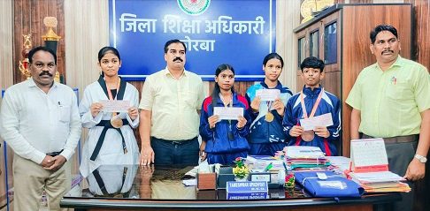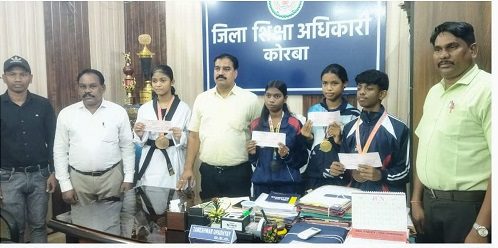 कोरबा 27 जून 2025/ राष्ट्रीय शालेय क्रीड़ा प्रतियोगिता में कोरबा जिले के पदक प्राप्त राष्ट्रीय खिलाड़ीयों को जिला प्रशासन के निर्देशानुसार तामेश्वर उपाध्याय जिला शिक्षा अधिकारी कोरबा ने गुरुवार को तुलसी मानिकपुरी पिता स्व नयनदास मानिकपुरी नेटबाल बालिका 19वर्ष शा उमावि विद्या. पी डब्ल्यू डी रामपुर कोरबा ने 67वीं राष्ट्रीय खेल रेवारी हरियाणा में तृतीय स्थान प्राप्त कर ब्रांज मेंडल, कु झिलमिल ठाकुर पिता स्व राजेन्द्र सिंह ठाकुर शा पू मां शा पी डब्ल्यू डी रामपुर कोरबा ने नेटबाल बालिका 14वर्ष 68वीं राष्ट्रीय खेल कोरबा छत्तीसगढ़ में गोल्ड मेडल प्राप्त किया तथा कु . पूर्वी कंवर पिता राम लखन कंवर ब्रिलियंट पब्लिक स्कूल कोरबा ने ताइक्वांडो बालिका 14वर्ष में 68वीं राष्ट्रीय खेल विदिशा मध्य प्रदेश से प्रथम स्थान प्राप्त कर गोल्ड मेडल प्राप्त किया एवं वेदांत कश्यप पिता नरेश कश्यप डीपीएस बालको नगर ने ताइक्वांडो 14वर्ष बालक वर्ग में 68 वीं राष्ट्रीय शालेय खेल प्रतियोगिता विदिशा मध्य प्रदेश से तृतीय स्थान ब्रांज मेंडल प्राप्त किया। जिन्हें छत्तीसगढ़ शासन के आदेशानुसार लोक शिक्षण संचालनालय नवा रायपुर के द्वारा कु तुलसी मानिकपुरी को 10000 , कु. झिलमिल ठाकुर को 21000 , पूर्वी कंवर 21000 , वेदांत कश्यप को 10000 का बैंक ड्राफ्ट जिला शिक्षा अधिकारी कोरबा के द्वारा प्रदान किया.