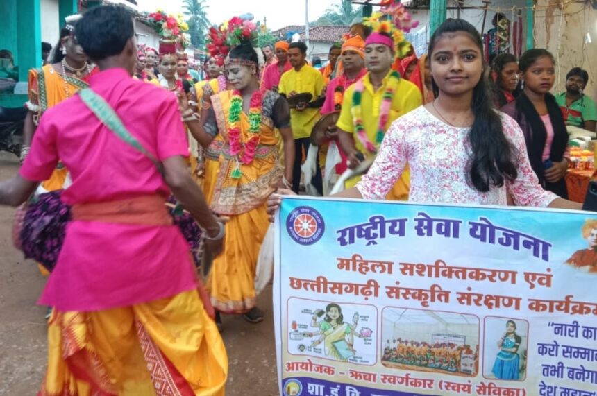 स्वयं सेविका ने बताया कि अब छत्तीसगढ़ी संस्कृति लुप्त होती जा रही है सभी वर्तमान समय की संस्कृति अपना रहे हैं और अपनी पुरानी संस्कृति भूलते जा रहे हैं जो कि हमारी धरोहर है साथ ही महिलाओं को सशक्त बनाने हेतु उनको उनके सारे अधिकार और उनके लिए निकली शासकीय योजनाओं की जानकारी दे जागरूक किया। इसी बीच प्रो अजय पटेल द्वारा बताया गया कि हमारी संस्कृति हमारे लिए बहुत महत्वपूर्ण है यह हमारी पहचान है और हमें खुद जागरूक होकर लोगों को भी जागरूक करना चाहिए जिससे हमारी संस्कृति बचे और हमारे पास बनी रहे।साथ ही प्रो मधु द्वारा महिलाओं की ओर इशारा करते हुए सभी को जानकारी दी गयी कि पुरातन समय से ही महिलाएं जमीन से लेकर आसमान तक हर क्षेत्र मेंआगे हैं वहीं गांव की महिलाओं को विभिन्न योजनाओं के लाभ के बारे में जानकारी दे जागरूक किया गया.