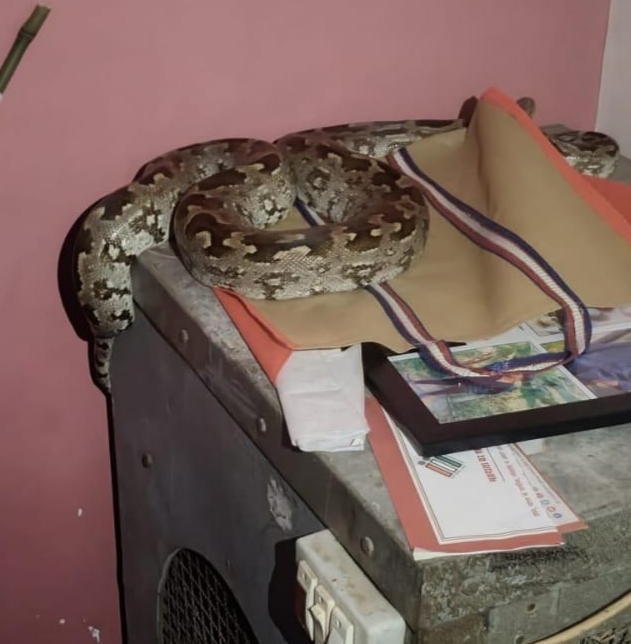 कोरबा, 29 जून 2025/ जहरीले जीव जंतुओं को लेकर जिले के शहरी क्षेत्रों में लोग जागरूक रहते हैं वहीं अब ग्रामीण क्षेत्रों में भी लोग जागरूक नज़र आते हैं, ताज़ा मामला भूलसीडीह गांव का है जहां एक भारी भरकम अजगर रात के अंधेरे में एक व्यक्ति के घर में घुसा और कमरे में लगे कूलर के ऊपर जाकर बैठ गया, अजगर को देखकर घर वालों के हाथ पैर फूल गए, डरे सहमे घर वालों ने उसको छेड़ने की बजाए रेस्क्यु टीम को जानकारी देना ज्यादा जरूरी समझा और तत्काल इसकी सूचना वाइल्डलाइफ रेस्क्यु टीम के प्रमुख जितेंद्र सारथी को दिया गया, सूचना मिलने पर जितेंद्र तत्काल रात्रि 10 बजे भूलसीडीह गांव के लिए रवाना हुए, जब मौके स्थल पर पहुंच कर देखा तो घर के साथ पूरे गांव की बिजली गुल थी जिसके कारण रेस्क्यु में दिक्कत हो रही थी. जितेंद्र सारथी ने सबसे पहले घर वालों को कमरे से सुरक्षित बाहर निकाला और वहां मौजूद लोगों से फोन का टॉर्च चालू कर रौशनी दिखाने की बात कहीं, टॉर्च की रौशनी में बड़ी सावधानी से अगजर को रेस्क्यु किया गया और थैले में रखकर जंगल में छोड़ दिया गया. तब जाकर घर वालों को राहत पहुंची.
