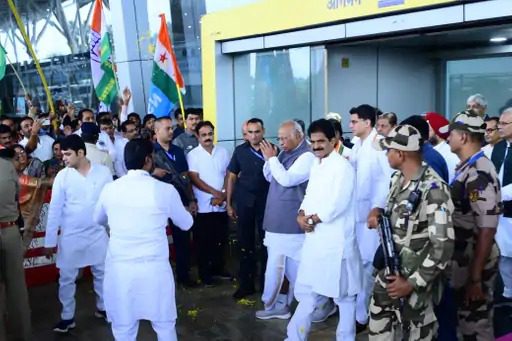 रायपुर, 07 जुलाई 2025/ कांग्रेस अध्यक्ष मल्लिकार्जुन खड़गे रायपुर एयरपोर्ट पहुंचे, जहां कांग्रेसियों ने गर्मजोशी से उनका स्वागत किया, जिसके बाद एयरपोर्ट से खड़गे साइंस कॉलेज मैदान में आयोजित किसान, जवान, संविधान सभा में शामिल हुए। कार्यक्रम के मंच में छत्तीसगढ़ सह-प्रभारी जरिता लैतफलांग, पूर्व पीसीसी चीफ मोहन मरकाम, प्रेम साय सिंह टेकाम सहित कई वरिष्ठ नेता मौजूद हैं.
