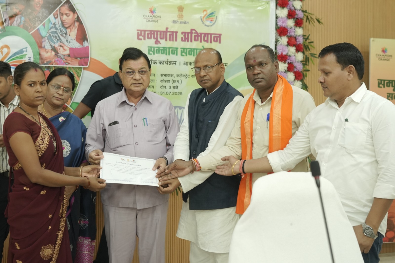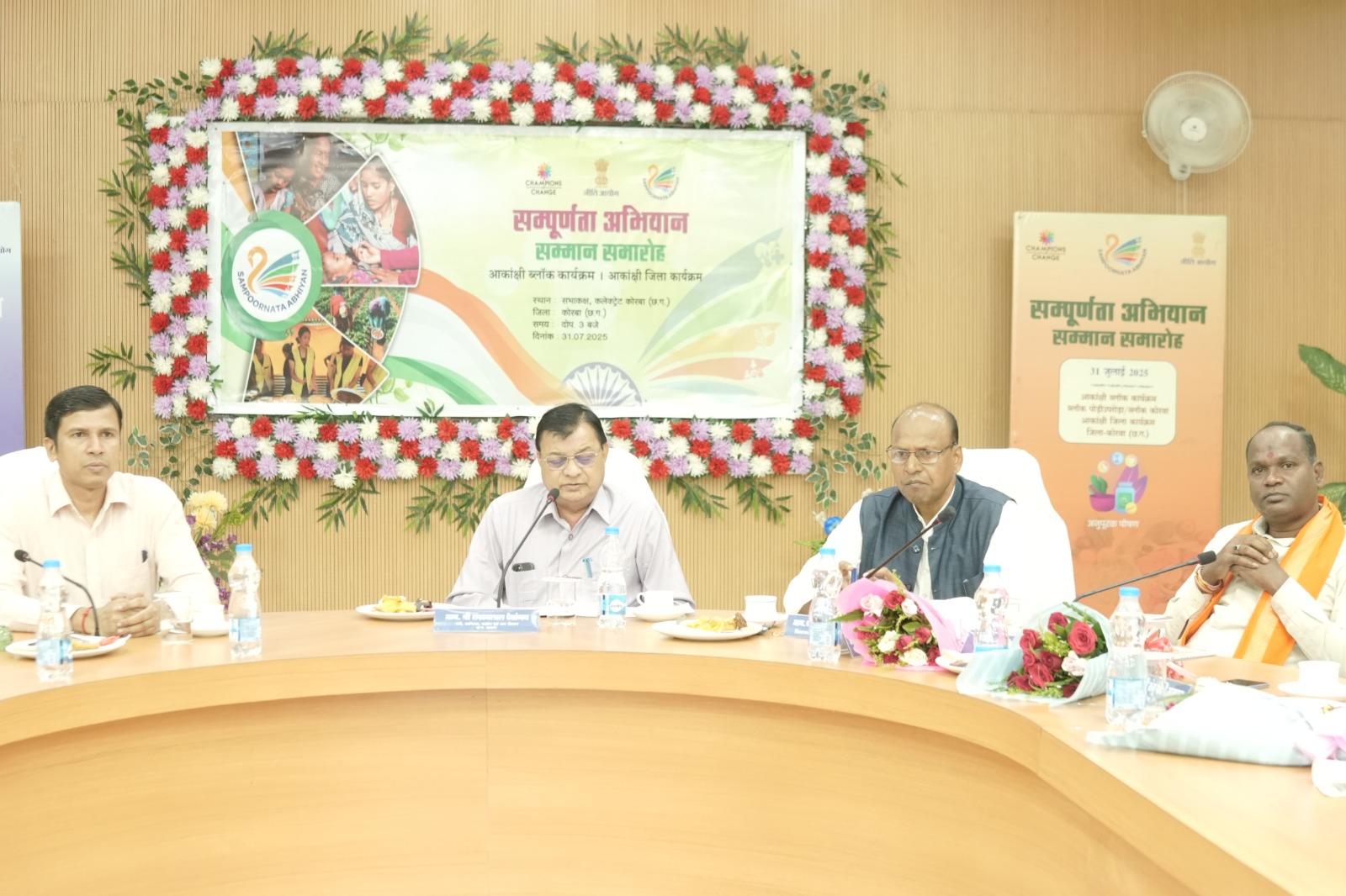 कोरबा, 31 जुलाई 2025/ नीति आयोग के तत्वावधान में संपूर्णता अभियान सम्मान समारोह कार्यक्रम का आयोजन आज कलेक्ट्रेट सभाकक्ष में किया गया। इस अवसर पर मुख्य अतिथि छत्तीसगढ़ शासन के वाणिज्य, उद्योग एवं श्रम मंत्री लखनलाल देवांगन रहे.