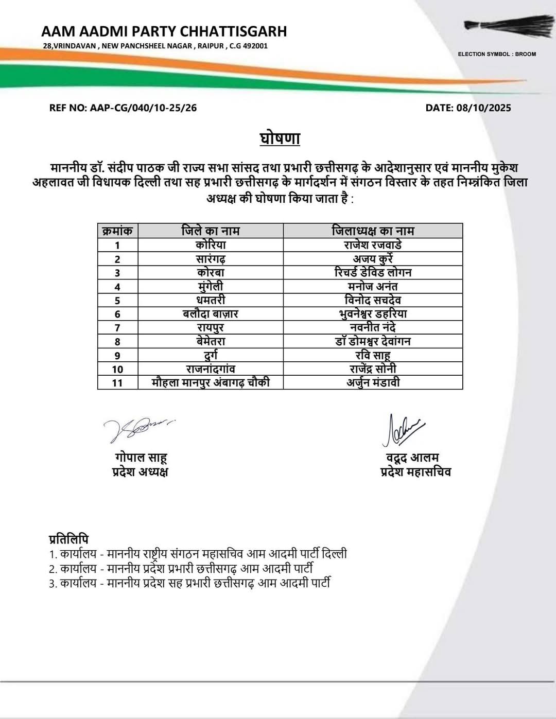छत्तीसगढ़, कोरबा/ 11 अक्टुबर 2025/आम आदमी पार्टी के प्रदेश संगठन विस्तार के तहत 11 जिलों मे जिलाध्यक्षों की नियुक्ति की गई है, आम आदमी पार्टी के वरिष्ठ नेता डॉ. संदीप पाठक राज्य सभा सांसद तथा प्रदेश प्रभारी छत्तीसगढ़ के आदेशानुसार मुकेश अहलावत विधायक दिल्ली तथा सह प्रभारी छत्तीसगढ़ के मार्गदर्शन में गोपाल साहू प्रदेश अध्यक्ष, वढूद आलम प्रदेश महासचिव द्वारा संगठन विस्तार के तहत नामांकित जिलाध्यक्षों की घोषणा किया गया है. जिसमें कोरबा जिला से पार्टी के जुझारू और कर्मठ कार्यकर्ता बालको निवासी रिचर्ड डेविड लोगन के नाम का चयन करते हुए उन्हे जिलाध्यक्ष का कमान सौंपा है. जिलाध्यक्ष की.बड़ी जिम्मेदारी मिलने से श्री डेविल लोगन के समर्थकों मे उत्साह का माहौल है और उन्हे विश्वास है कि इस नियुक्ति से पार्टी को बेहतर मजबूती मिलेगी, वहीं जिलाध्यक्ष पद पर नियुक्ति होने के बाद रिचर्ड डेविड लोगन ने कहा आम जनता की हक का आवाज़ बनकर उन्हे उनका हक दिलाने के लिए आम आदमी पार्टी ने जो जिम्मेदारी दी है उसे बखूबी निभाएगे.
