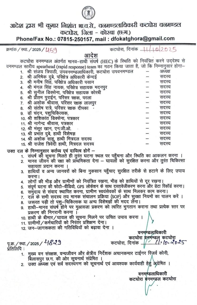वनमंडलाधिकारी कटघोरा कुमार निशांत ने आदेश में कहा है कि यह दल किसी भी संघर्ष की सूचना पर तुरंत मौके पर पहुंचेगा, घायलों को सुरक्षित करेगा और हाथियों को बिना नुकसान पहुंचाए सुरक्षित दिशा में मोड़ेगा। साथ ही, प्रत्येक घटना की फोटो-वीडियो व GPS लोकेशन सहित रिपोर्ट तैयार की जाएगी और मुआवजा प्रकरणों को प्राथमिकता से निपटाया जाएगा, दल के सदस्यों को समुदाय से संवाद, भीड़ नियंत्रण, जनजागरूकता और ग्रामीणों को प्रशिक्षण देने का दायित्व भी सौंपा गया है.