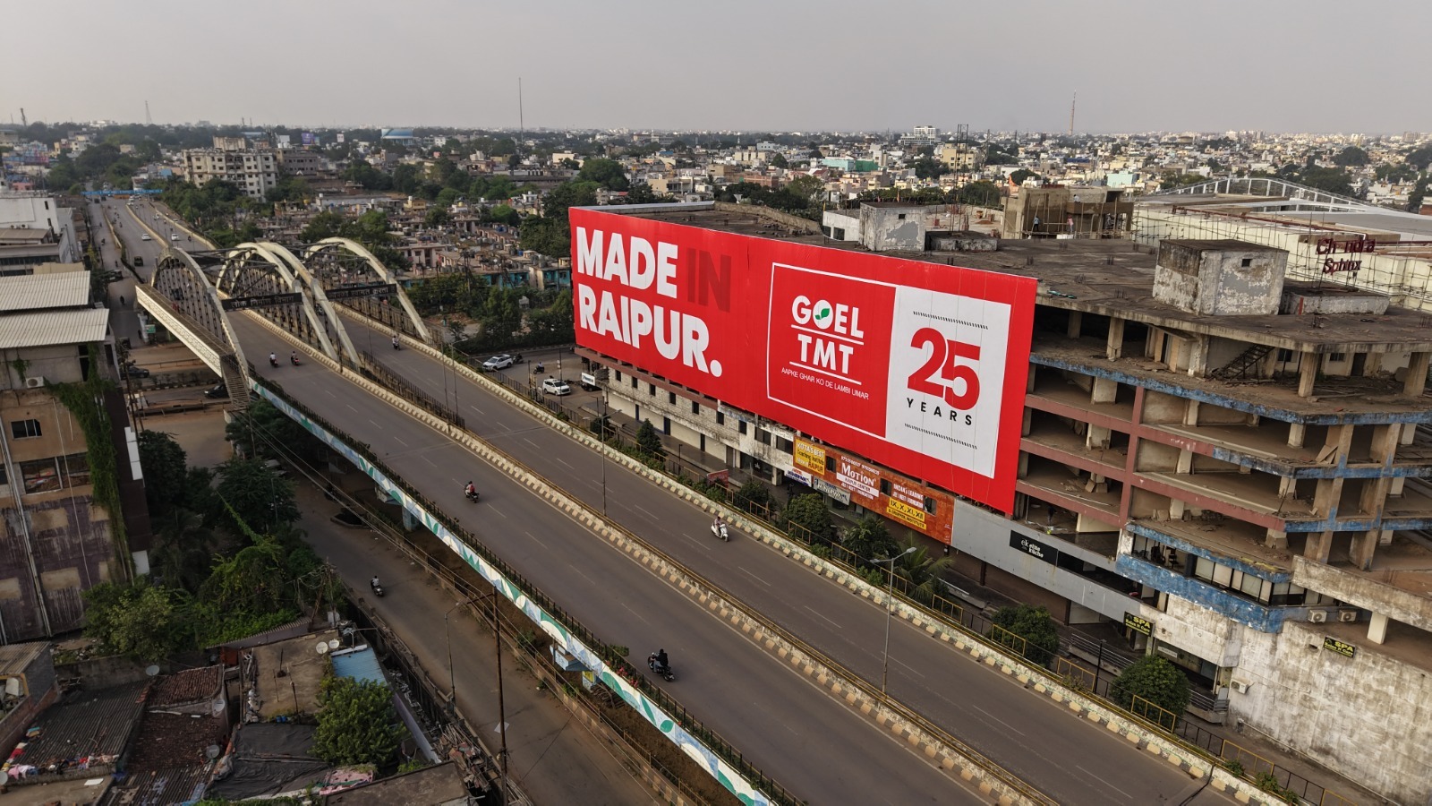 रायपुर। स्टील उद्योग की अग्रणी कंपनी श्री बजरंग पावर एंड इस्पात लिमिटेड *(गोयल TMT)* ने विज्ञापन के क्षेत्र में नया इतिहास रचते हुए रायपुर में भारत का सबसे बड़ा बिल्डिंग रैप स्थापित किया है। इस उपलब्धि के लिए *कंपनी को गोल्डन बुक ऑफ वर्ल्ड रिकॉर्ड्स की ओर से औपचारिक रूप से सम्मानित किया गया है.