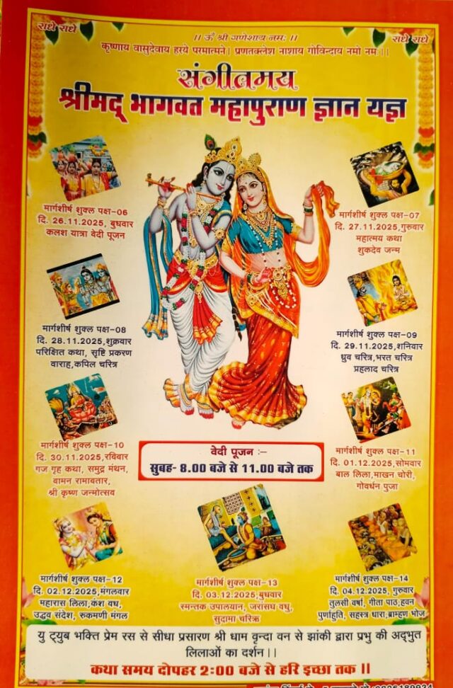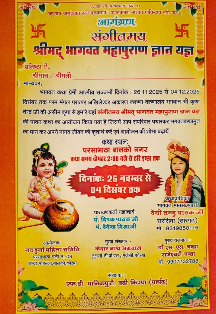 बालकोनगर, 25 नवंबर 2025/ बालकोनगर में परसाभाठा वार्ड क्रमांक 45 के गली नंबर-3 (चंद्रा मोहल्ला) स्थित दुर्गा पंडाल में नव दुर्गा महिला समिति द्वारा दिनांक 26 नवंबर 2025 से दिनांक 04 दिसंबर 2025 तक संगीतमय श्रीमद् भागवत महापुराण ज्ञान यज्ञ आयोजित है। सरसिवां (सारंगढ़) की कथावाचिका भागवत मानस ब्यास देवी तन्नु पाठक जी द्वारा 9 दिनों तक प्रतिदिन दोपहर 2 बजे से हरि इच्छा तक अपने श्रीमुख से कथा का वाचन किया जाएगा। संगीतमय श्रीमद् भागवत महापुराण ज्ञान यज्ञ के मुख्य संरक्षक तुलसी टीवीएस एजेंसी के संचालक केेदारनाथ अग्रवाल, संरक्षक पार्षद बद्री किरण व वरिष्ठ कार्यकर्ता एफडी मानिकपुरी है। मुख्य यजमान डॉ. एमएल चंद्रा व राजेश्वरी चंद्रा है। आयोजक नव दुर्गा महिला समिति ने पावन कथा आयोजन में सभी जिला वासियों से सपरिवार पधारकर भगवतकथामृत का पान करके अपने मानव जीवन को कृतार्थ करने एवं आयोजन की शोभा बढ़ाने की अपील की है.