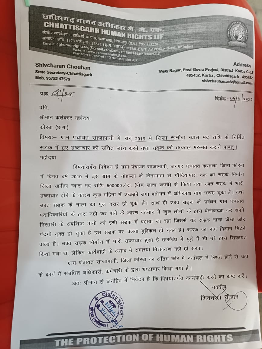 कोरबा, 26 नवंबर 2025/ करतला ब्लाक के ग्राम पंचायत साजापानी में सन् 2019 में जिला खनीज न्यास मद राशि से निर्मित सड़क में हुए भ्रष्टाचार की उचित जांच करने तथा सड़क को तत्काल मरम्मत कराने के लिए छत्तीसगढ मानव अधिकार जे. जे. एफ के प्रदेश सचिव शिव चौहान ने कलेक्टर को पत्र लिखा है.