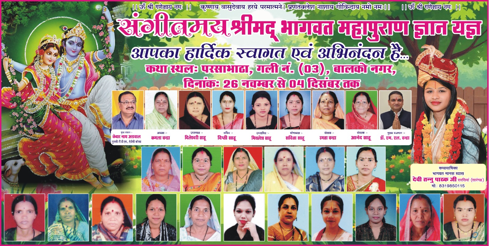 नव दुर्गा महिला समिति ने 26 नवंबर से 4 अप्रैल तक आयोजित संगीतमय श्रीमद् भागवत महापुराण ज्ञान यज्ञ में प्रतिदिन दोपहर 2 बजे से रात में हरि इच्छा तक होने वाले कथा के दौरान शामिल होकर पुण्य को अर्जित करने के लिए सभी श्रद्धालुओं से कथा में शामिल होने की अपील की है.