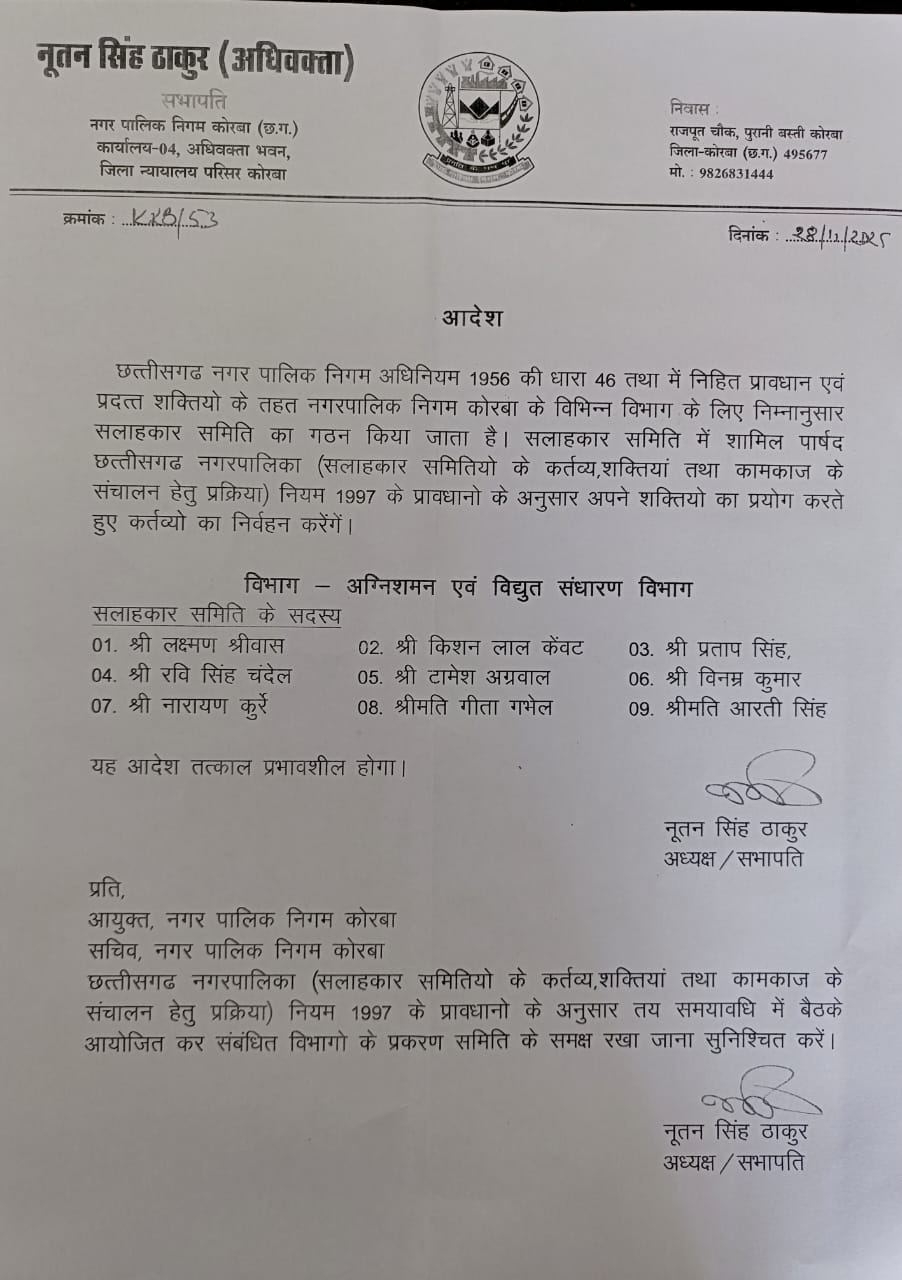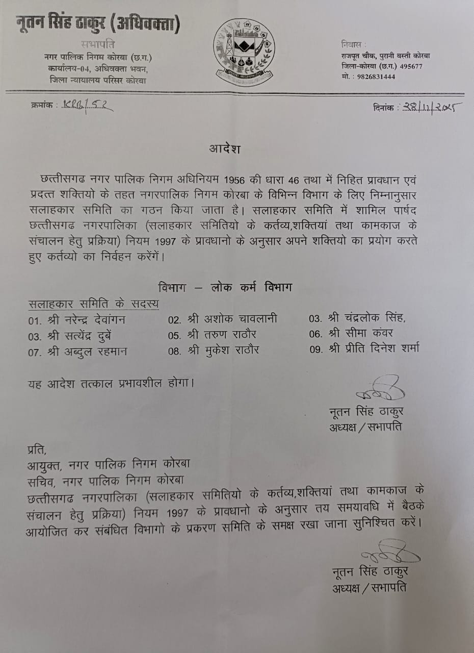छत्तीसगढ़ नगर पालिक निगम कोरबा के प्रावधान के अनुसार नगर पालिक निगम अध्यक्ष व सभापति नूतनसिंह ठाकुर ने आज 02 विभागों में सलाहकार समिति के गठन किया है.