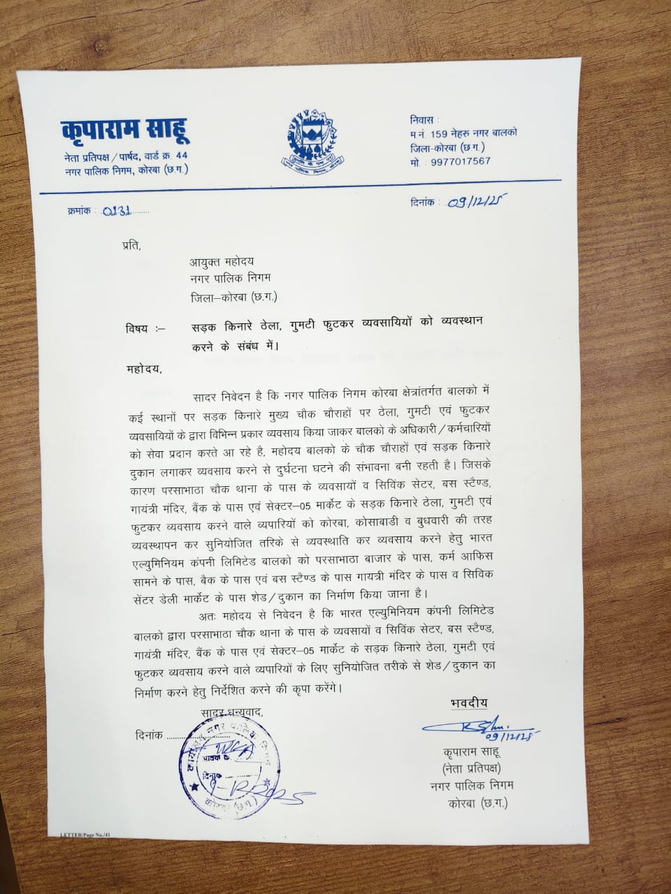 कोरबा, 11 दिसंबर 2025/ नगर पालिक निगम कोरबा के बालको क्षेत्र में सड़क किनारे अनियंत्रित तरीके से लगाए जा रहे ठेला, गुमटी और फुटकर दुकानों के व्यवस्थित पुनर्स्थापन को लेकर नेता प्रतिपक्ष कृपाराम साहू ने आयुक्त को पत्र लिखकर उचित कदम उठाने की मांग की है। उन्होंने कहा कि बालको के विभिन्न चौक–चौराहों, मुख्य मार्गों और संवेदनशील स्थलों पर लंबे समय से फुटकर व्यवसायी दुकानें लगाकर स्थानीय अधिकारियों, कर्मचारियों और आम नागरिकों को सुविधाएं प्रदान करते आ रहे हैं.