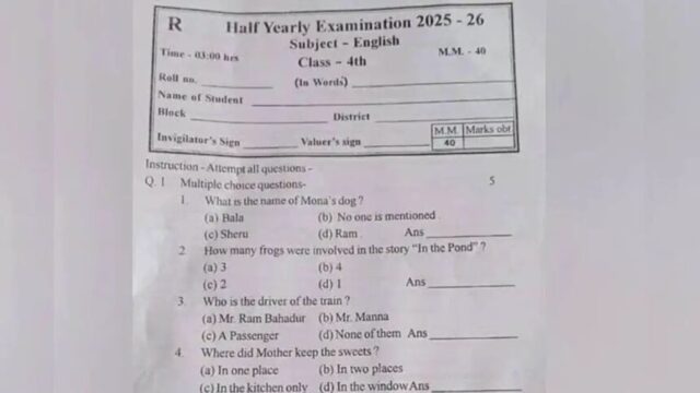 शिक्षा सत्र 2025-26 के तहत आयोजित अर्द्धवार्षिक परीक्षा में कक्षा चौथी के अंग्रेजी प्रश्न पत्र में एक सवाल पूछा गया था कि “मोना के कुत्ते का नाम क्या है?”। इस बहुविकल्पीय प्रश्न के उत्तर के लिए चार विकल्प दिए गए थे, जिनमें ‘शेरू’ के साथ ‘राम’ नाम का विकल्प भी शामिल था। इस मामले की शिकायत होने पर विभाग ने इसे गंभीरता से लिया और माना कि ‘राम’ हिंदू धर्म के आराध्य देव हैं और कुत्ते के नाम के विकल्प के रूप में उनका नाम देना धार्मिक भावनाओं को आहत करने वाला है। मामले में शिक्षा विभाग ने पांच सदस्यीय जांच कमेटी गठित की थी.