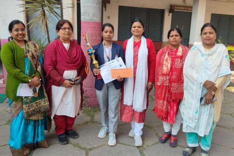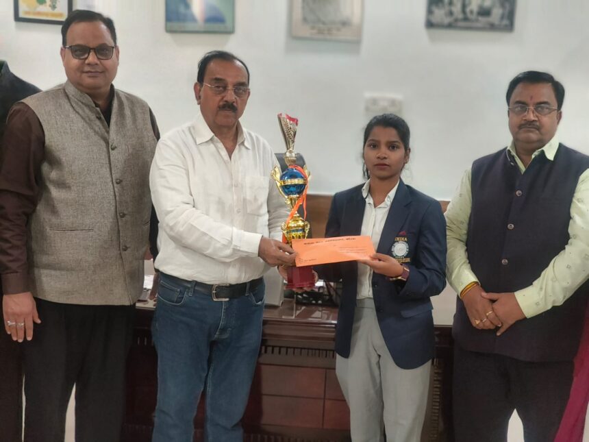कोरबा, 13 जनवरी 2026/ प्रथम साउथ एशियन गोल शॉट बॉल चैंपियनशिप में नेपाल से भारत के लिए स्वर्ण पदक लेकर आने वाली कोरबा जिले की बेटी कुसुम साहू का कमला नेहरू महाविद्यालय समिति एवं प्राध्यापकों ने सम्मान किया। इस अवसर पर समिति के अध्यक्ष किशोर शर्मा ने काॅलेज की इस होनहार छात्रा एवं अंतर्राष्ट्रीय खिलाड़ी को 2100 रुपये का नकद पुरस्कार व ट्राॅफी प्रदान कर सम्मानित किया। इस अवसर पर समिति के सहसचिव उमेश लाम्बा एवं प्राचार्य डाॅ प्रशांत बोपापुरकर समेत महाविद्यालय के प्राध्यापकगणों ने उपस्थिति दर्ज कराते हुए उन्हें उज्ज्वल भविष्य का आशीर्वाद दिया.