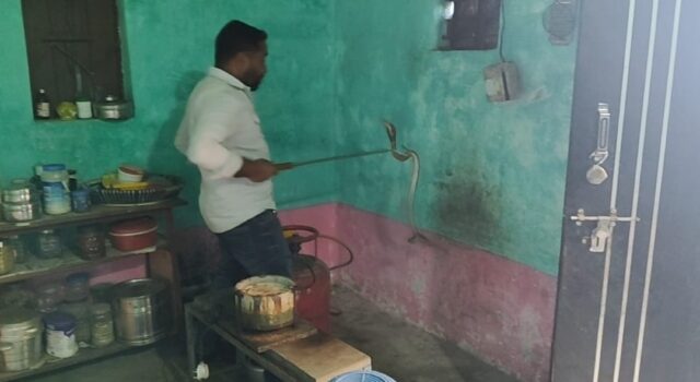 कोरबा, 14 जनवरी 2026/ कोरबा जिले के सिंगापुर क्षेत्र मे मंगलवार दोपहर एक घर के किचन में सिलेंडर के पीछे फन फैलाए हुए नाग बैठा था, रसोई में खाना बनाने के लिए जब महिला (अर्चना कंवर) पहुंची तो नाग के फुंकार की आवाज सुनकर घबरा गई, जब उनकी नज़र फन फैलाए बैठे नाग पर पड़ी तो डर से बाहर निकल गई, महिला ने तुरंत पड़ोसियों को बुलाया, लेकिन किसी ने भी नाग सांप को बाहर निकालने की हिम्मत नहीं जुटाई,