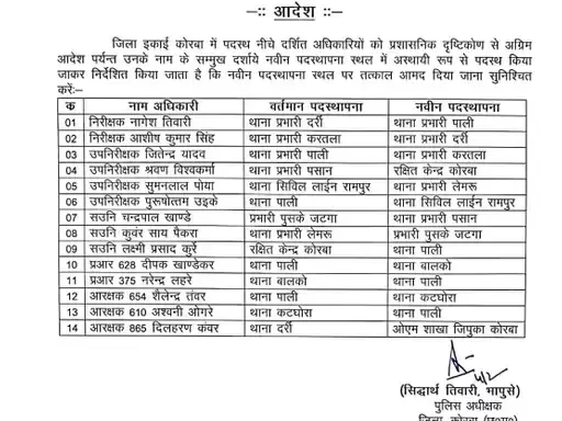 उरगा थाना प्रभारी राजेश तिवारी, हरदीबाजार थाना प्रभारी प्रमोद डनसेना, दीपका थाना प्रभारी प्रेमचंद साहू, कुसमुंडा थाना प्रभारी मृत्युंजय पांडे, बालको थाना प्रभारी युवराज सिंह तिवारी, बांकी मोंगरा थाना प्रभारी चमन सिन्हा और कटघोरा थाना प्रभारी धर्म नारायण तिवारी भी अपने पदों पर बने रहेंगे.