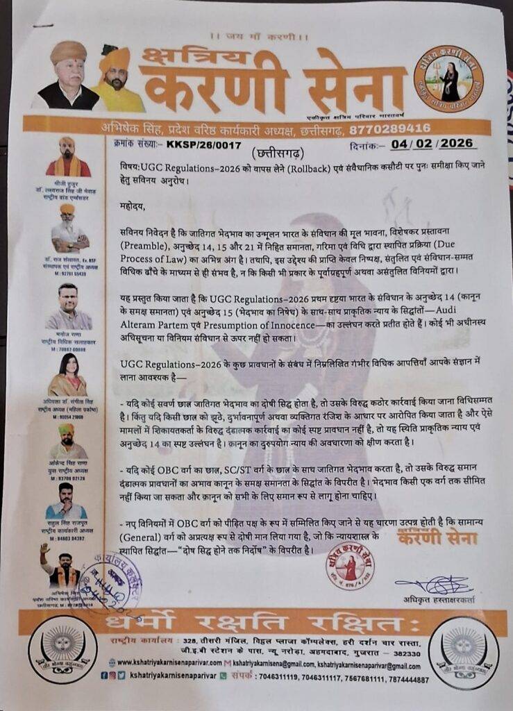 कोरबा, 06 फरवरी 2026/ महाराणा प्रताप भवन में क्षत्रिय करणी सेना कोरबा ने संघ के जिला अध्यक्ष बिपिन सिंह के नेतृत्व मे USG रेगुलेशन को वापस लेने व संवैधानिक कसौटी पर पुनः समीक्षा किए जाने को लेकर प्रदर्शन किया, जिसके बाद कलेक्टर को ज्ञापन सौपा गया.