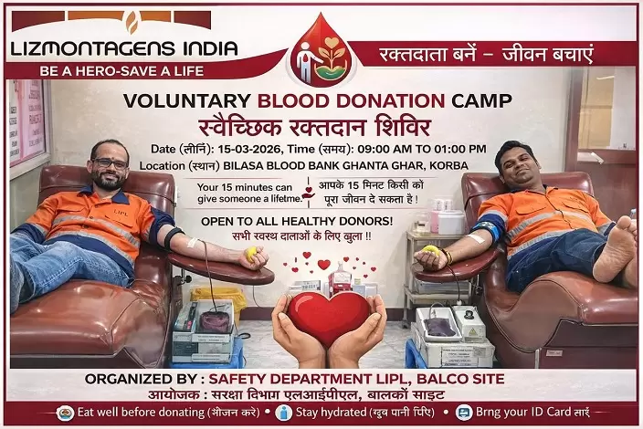 कोरबा,16 मार्च 2026/ नेशनल सेफ्टी मंथ के उपलक्ष्य में LIPL सेफ्टी टीम (बालको साइट) द्वारा रविवार को कोरबा स्थित बिलासा ब्लड बैंक में स्वैच्छिक रक्तदान शिविर का आयोजन किया गया। सामुदायिक स्वास्थ्य और सुरक्षा के प्रति जागरूकता बढ़ाने के उद्देश्य से आयोजित इस शिविर में बड़ी संख्या में लोगों ने उत्साहपूर्वक भाग लिया.