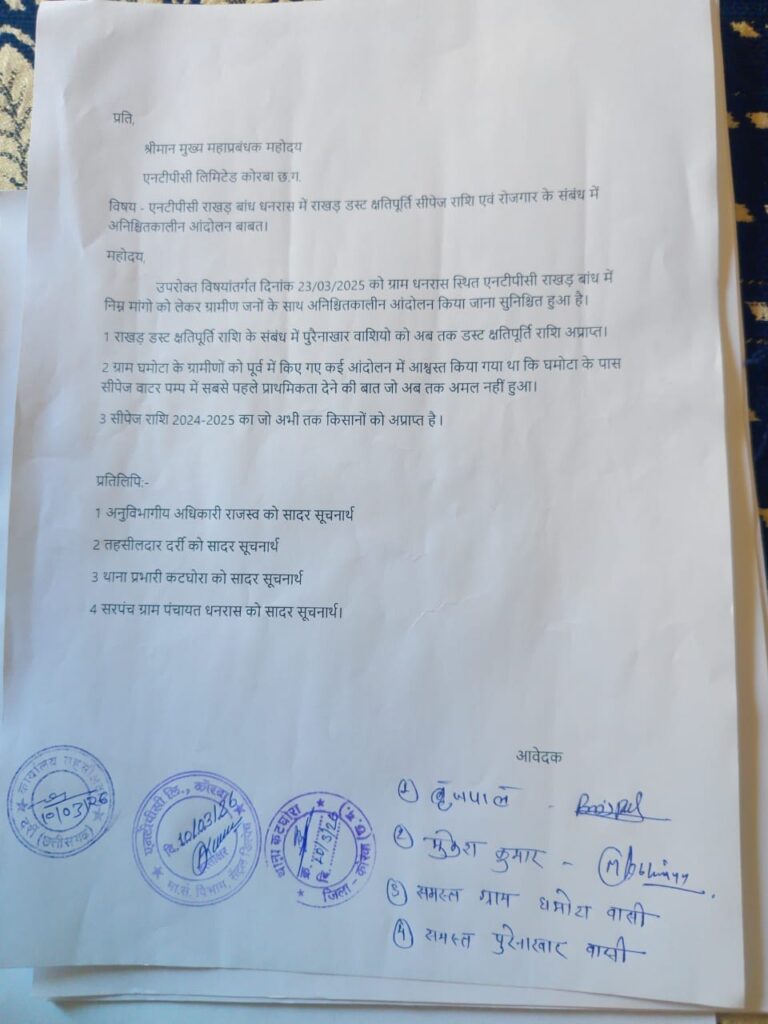 उन्होंने एनटीपीसी प्रशासन से प्रदूषण की समस्या का समाधान करने और उन्हें मुआवजा देने की मांग की है। धनरास निवासी बृजपाल खुटी ने बताया कि 10 दिन पहले ही आंदोलन की चेतावनी दी गई थी। ग्रामीणों को एक साल से राखड़ धूल क्षतिपूर्ति नहीं मिली है। स्थानीय लोगों को नौकरी में प्राथमिकता देने का वादा भी पूरा नहीं हुआ है। एनटीपीसी प्रशासन ने अभी तक इस मामले पर कोई प्रतिक्रिया नहीं दी है.
