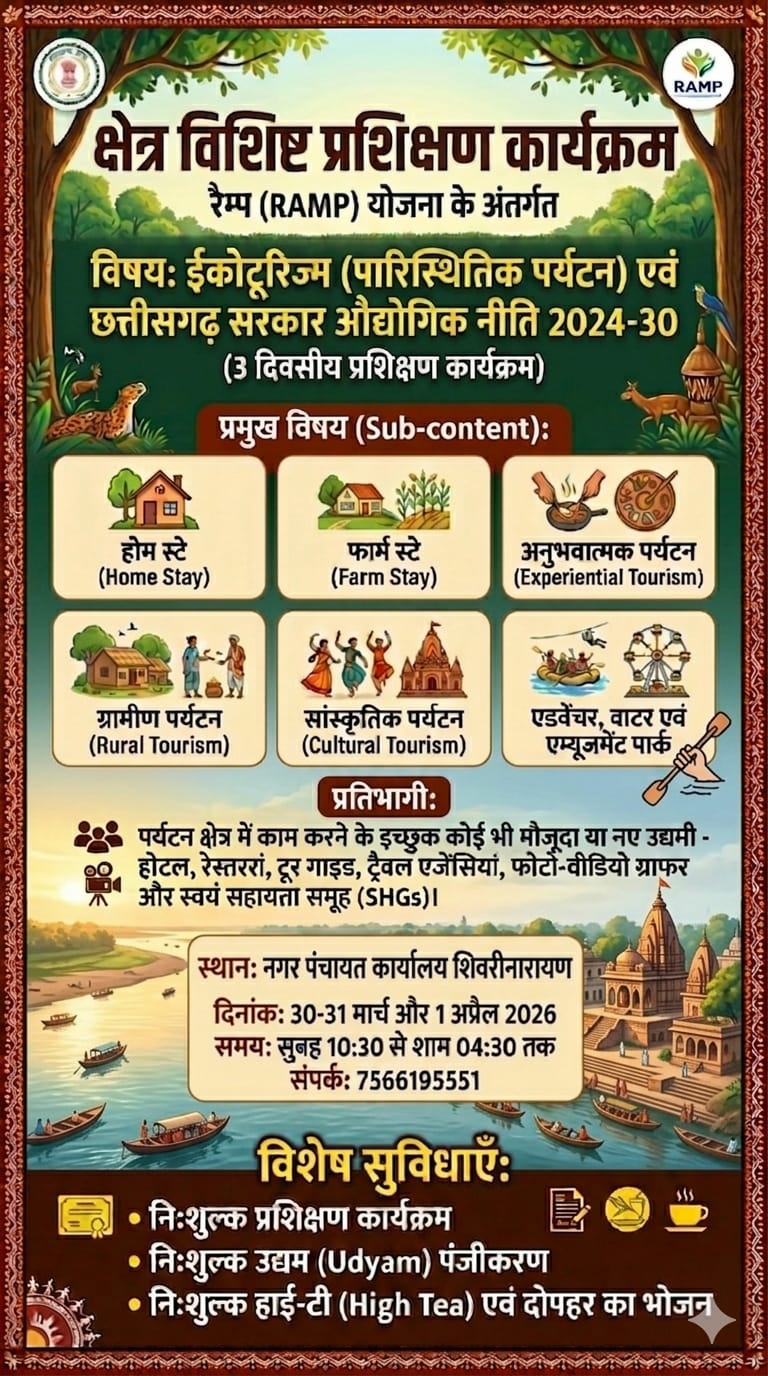 जांजगीर चांपा, 28 मार्च 2026/ भारत सरकार की रैंप योजना अंतर्गत सीएसआईडीसी रायपुर के बैनर तले एनआईएमएसएमई हैदराबाद द्वारा सेक्टर स्पेसिफिक ट्रेनिंग प्रोग्राम के तहत 30, 31 मार्च एवं 1 अप्रैल को सीएमओ ऑफिस, शिवरीनारायण में 3 दिवसीय इको टूरिज्म प्रशिक्षण कार्यक्रम आयोजित किया जाएगा। प्रशिक्षण तीन दिवस होगा, प्रशिक्षण तीन दिवस में सुबह 10:30 से शाम के 4:30 बजे तक आयोजित होगी.