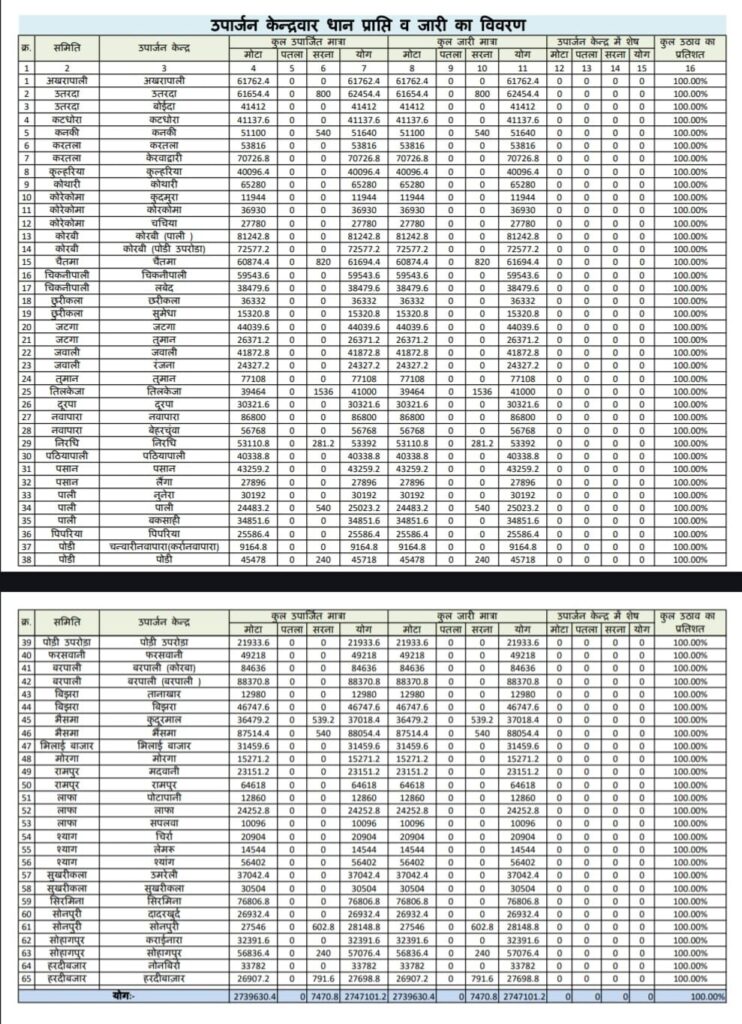 इस अभियान में बरपाली समिति सबसे आगे रही, जहां 88 हजार 370.8 क्विंटल धान की खरीदी कर शत-प्रतिशत परिदान किया गया। इस उपलब्धि के लिए समिति को सर्वाधिक 4 लाख 41 हजार 854 रुपए प्रोत्साहन राशि मिलेगी.
